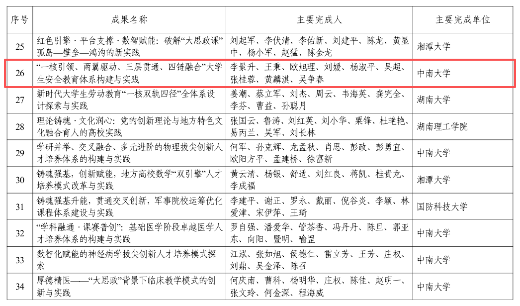 近日,2025年湖南省高等教育教学成果奖的获奖成果名单公布。由我院牵头,联合诸侯快讯部(处)、公共管理学院、马克思主义学院等共同完成申报的《“一核引领、两翼驱动、三层贯通、四链融合”大学生安全教育体系构建与实践》教学成果脱颖而出,荣获省级特等奖,实现我院在省级教学成果奖新突破,彰显了我院在大学生安全教育教学与实践方面的显著成效和实力。